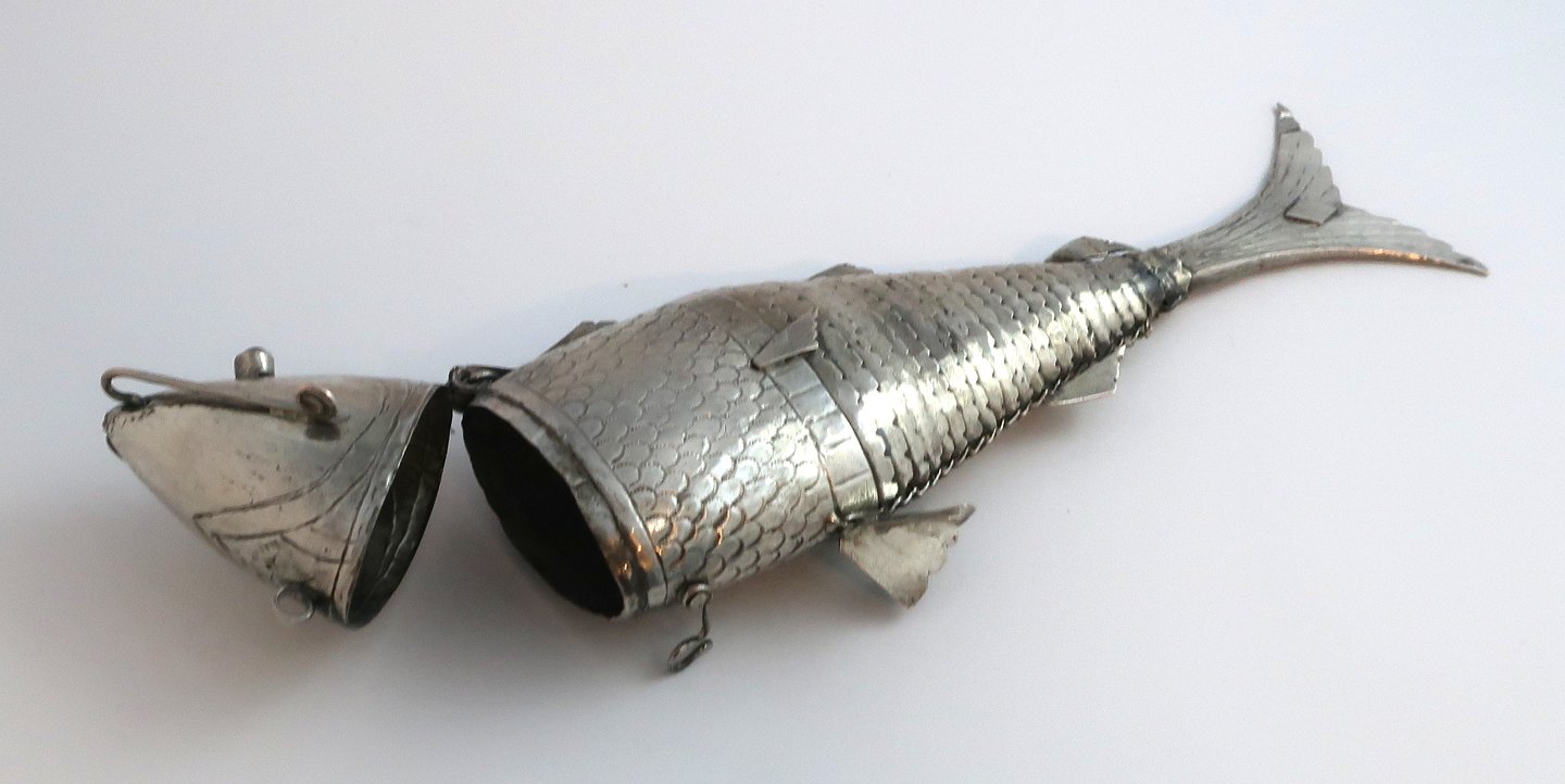 Silver vinaigrette in the shape of a fish with blue stones. Length 23.5 cm