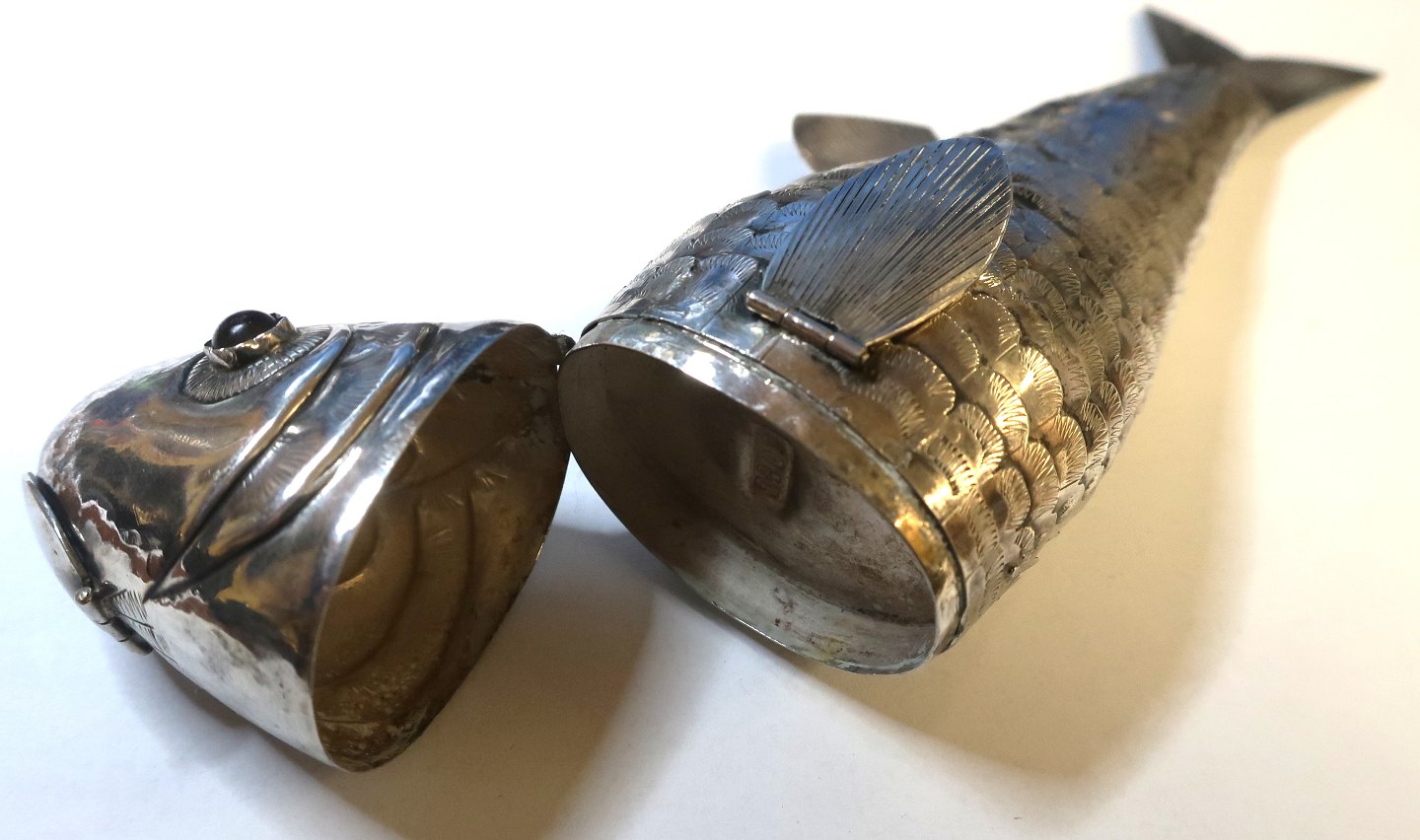 Silver vinaigrette in the shape of a fish with red stones. Length 17 cm